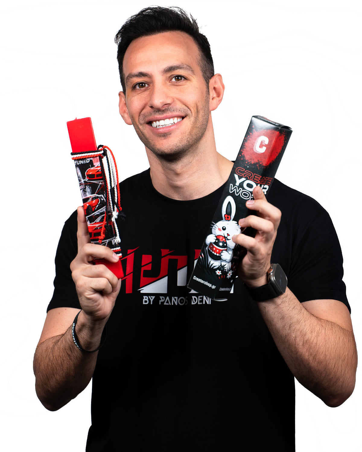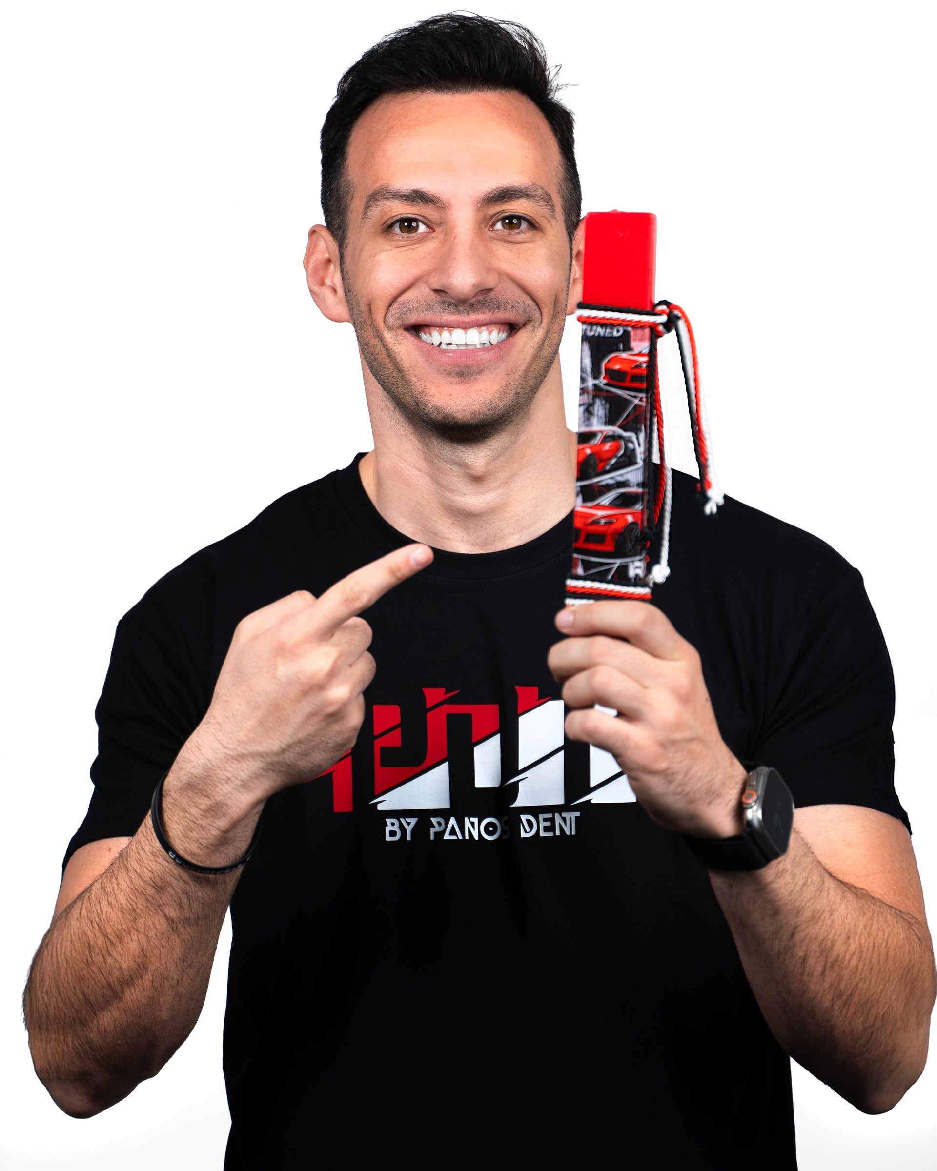Μια ξεχωριστή πασχαλινή λαμπάδα εμπνευσμένη από το δυναμικό στυλ του PanosDent, με εντυπωσιακό design που ξεχωρίζει. Η ιδανική επιλογή για όσους θέλουν να γιορτάσουν το Πάσχα με κάτι πραγματικά ιδιαίτερο. Χειροποίητη πλακέ μασίφ λαμπάδα διαστάσεων 25 × 3,5 × 1,5 cm, διακοσμημένη με κερωμένο αυτοκόλλητο και κορδονάκι 3 mm, που της δίνουν μια προσεγμένη και ξεχωριστή εμφάνιση. 🎁 Δώρο: Μαζί με τη λαμπάδα περιλαμβάνεται ξύλινο προστατευτικό, το οποίο τοποθετείται περιμετρικά ώστε να βοηθά στο να μην στάζει το κερί κατά τη διάρκεια της Ανάστασης.