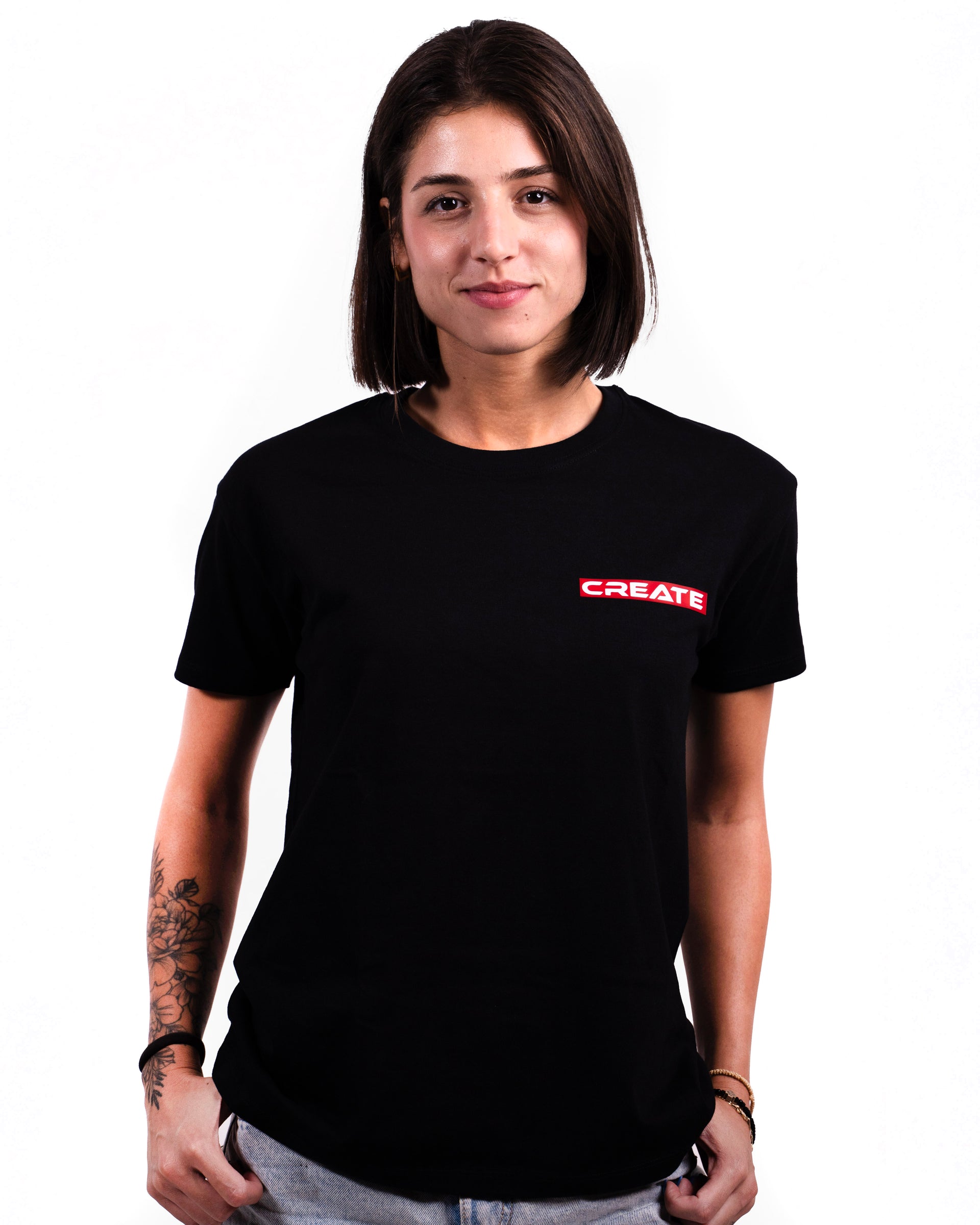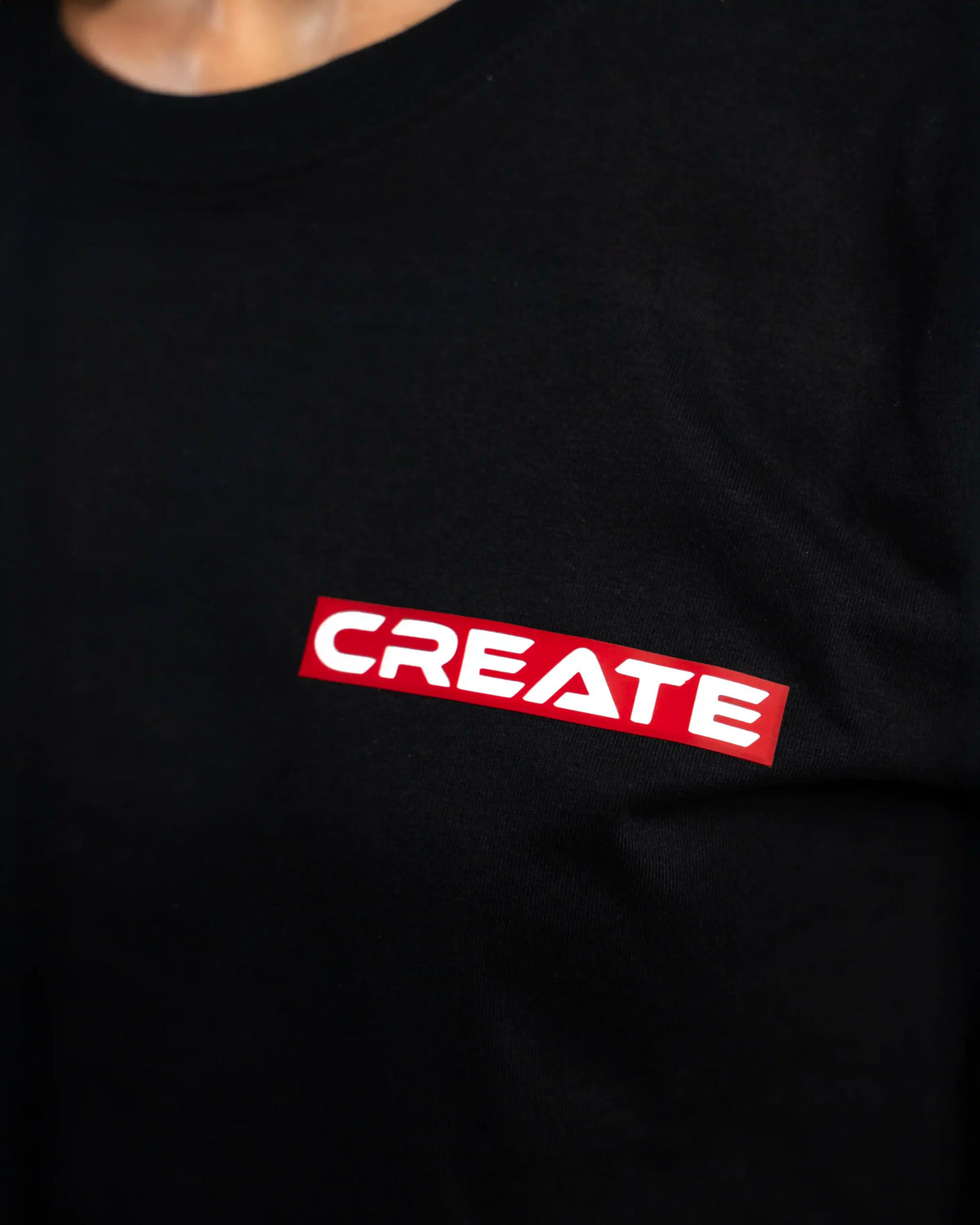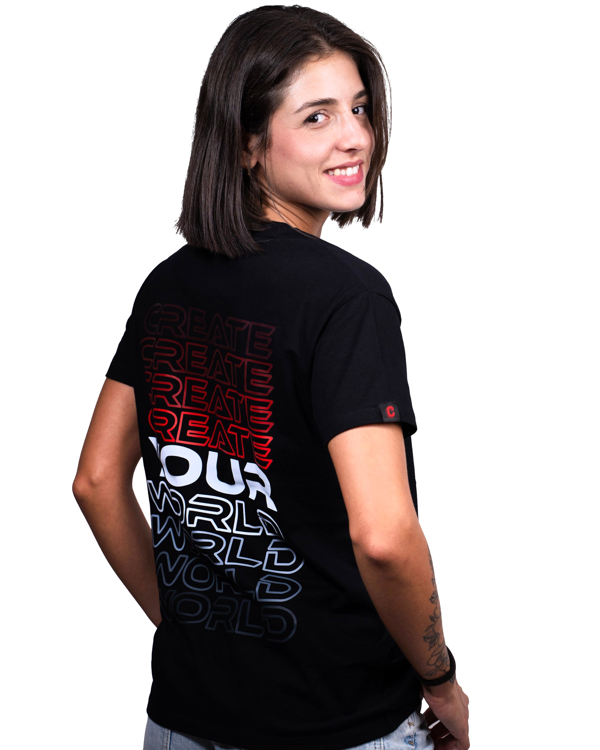 👕 Κοντομάνικο T-shirt σε μαύρο χρώμα 🧱 Μπροστά: “CREATE” σε brick-style print με έντονο κόκκινο φόντο – δυναμικό, ξεκάθαρο ⚫ Στο μανίκι: Διακριτική λεπτομέρεια “C” – το σήμα κατατεθέν του Creatorshop 🌀 Στην πλάτη: Multilayer τύπωμα CREATE YOUR WORLD σε ντεγκραντέ κόκκινο–λευκό–μαύρο, που ενισχύει την αίσθηση κίνησης και βάθους 🌱 100% βαμβάκι – υψηλής ποιότητας, φιλικό προς το δέρμα και άνετο για όλη μέρα 📛 Περιλαμβάνει αυθεντικό Creatorshop tag